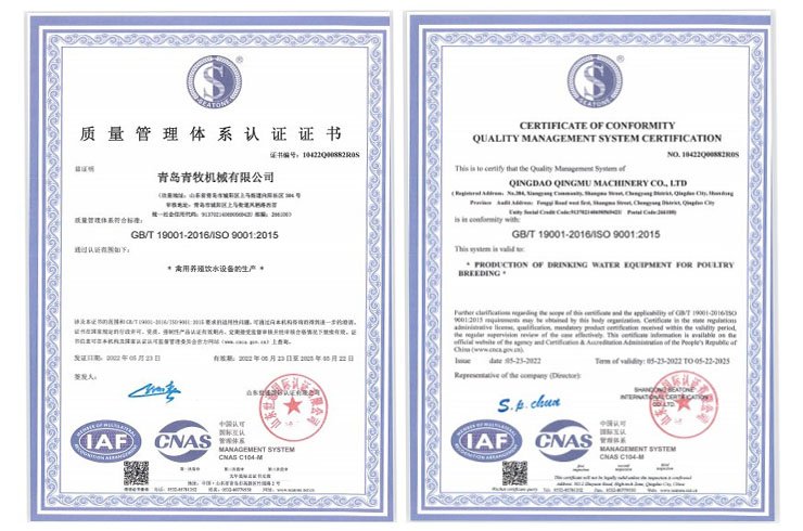青島青牧機械有限公司成立于2013年,是一家集研發、生產、銷售、服務于一體的綜合性企業。公司專注于家禽飲水設備的研發和生產,擁有專業的研發團隊、先進的加工設備以及自動化組裝線,力求打造“簡單、高效、環保”的高端禽用飲水系統。